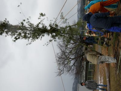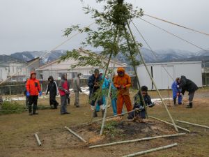 雨と風が心配でしたが、中島地区の老人会、ときわ会の方々、そして、5、6年生のお手伝いにより1時間もかからず立派な櫓を立てることができました。