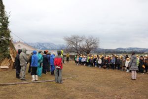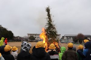準備が終わり、全校児童がそろい、9時15分頃から左義長を始めました。