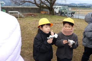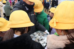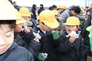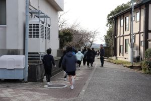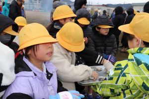 強い風が吹く中でしたが、各地区の見守り隊の方々に見守られながら、子ども達は元気に登校してきました。