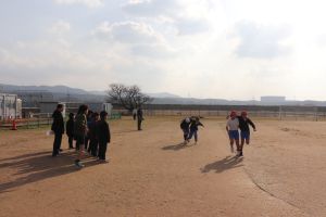 スポーツクラブ とても良い天気となり、運動場で綱とりや二人三脚、3年生と一緒に運動会のダンスを踊りました。
