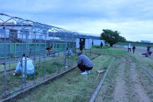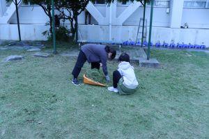 下級生は、お家の人と一緒にグランドの草むしりです。