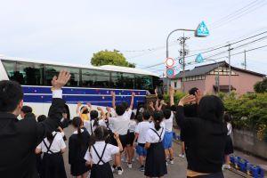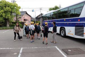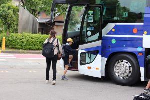 朝、集団で登校した後、玄関前に集まりバスに乗ります。