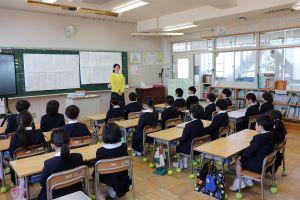 1年生、いい姿勢で担任の先生のお話を聞いていました。