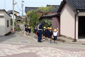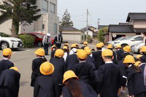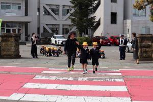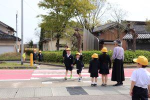 横断歩道や道路の渡り方を習い、実際に学校の周りを歩きました。