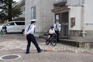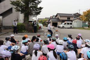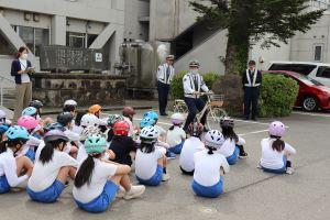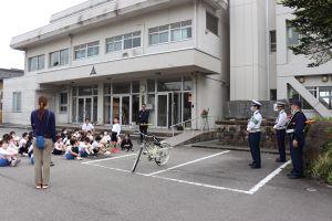 最初に、能美警察署の方から、自転車に乗る前に確認することや止まるときのブレーキのかけ方などのお話を聞きました。
