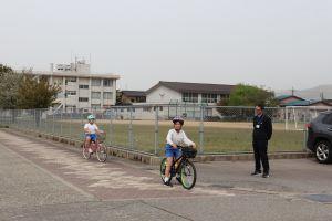 自転車に乗るところ、ブレーキをかけ止まって確認するところ、曲がるところなど実際道路に出て行いました。