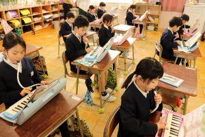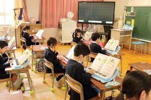 1年生は、鍵盤ハーモニカで「こいぬのマーチ」の練習をしていました。