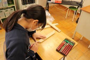 2年生は、図工でカッターの練習をしていました。ゆっくりと線の上を切っていました。