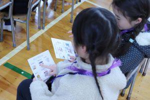 新1年生は、回ってきた場所にシールをはったカードを見ています。