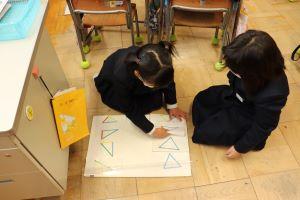 隣の人とペアになり、長さの違う色棒で、三角形を作り、仲間分けをします。