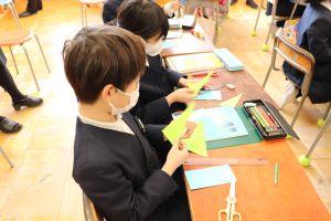 その後、折り紙を使い、三角形を作り、二等辺三角形になるわけを伝えあいます。
