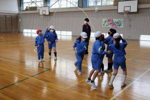 人数が少ない2年生は、6年生にも入ってもらい、8の字跳びを3分間跳びました。