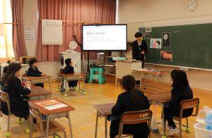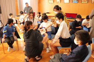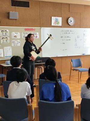 150周年記念式典で三味線の演奏をしてもらった湊さんに今回、4.5年生の音楽の授業に講師としてきていただきました。日本の伝統音楽、三味線の体験です。