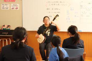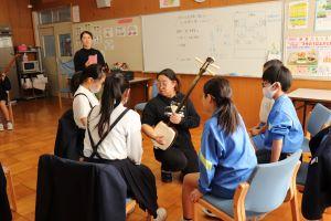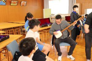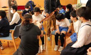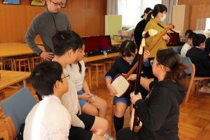三味線の持ち方やならし方をならい、グループに分かれて行いました。