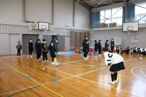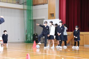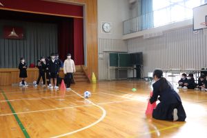 聞こえるように声を出したり、コーンをたたいて音を出したり、また、ける方向を指でしめしてもらい指示を与えるなどして、まっすぐけることができるようにしました。
