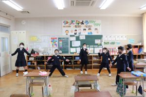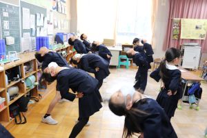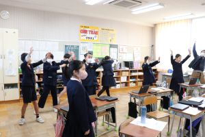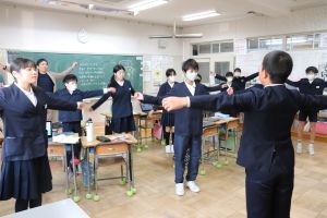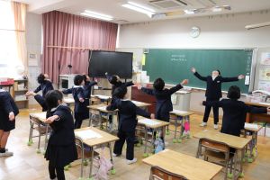 音楽が流れると、どの教室でも体操をしています。