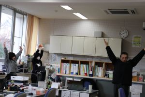 職員室では、「腕あがらない。」と言いながらも「これいいわー。」といいながら取り組んでいます。