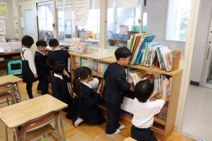 1年生は、冬休み前に、教室の本棚の本の整理をみんなで行っていました。