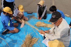 手をこすり合わせて、わらをねじる。ねじりながら、ねじってわらにする。