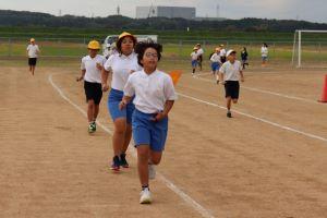 高学年は、1周をどのくらいの速さで走ったらよいかストップウォッチで計りながら、走っていました。
