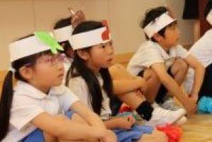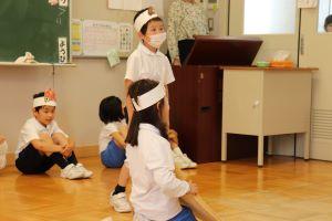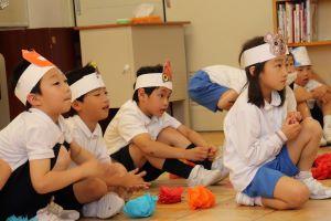 お面をつけて、どんな場面か分かった後、髙橋先生の質問に一生懸命こたえようと考えていました。