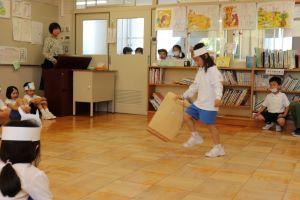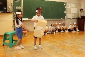 昨日の昼休みに1年生が6年生を招待して、国語の「はなのみち」の劇を発表しました。