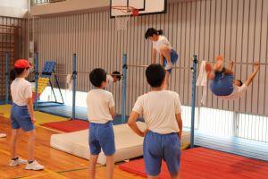 鉄棒とマット運動です。鉄棒は、手首の返しがなかなか難しいようでした。