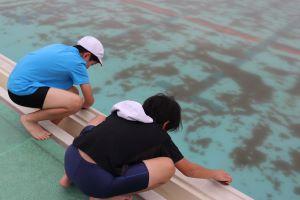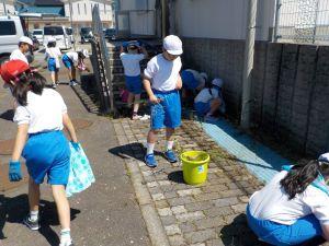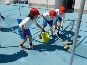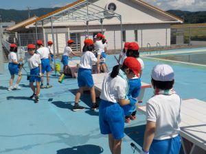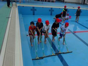 5.6年生が行う前に、5月31日に3.4年生がプール入り口の雑草をぬいたり、プールのまわりの溝にたまっていた落ち葉を取り除いたり、モップでプルサイドをきれいにしてくれたりしました。そのおかげで、今日は、プール内の掃除に集中できました。