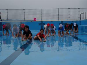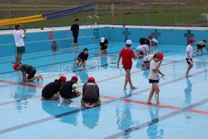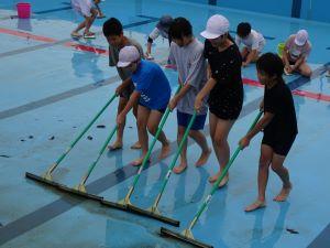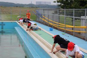 だんだんと水が減り、プール底をスポンジでこすりながらきれいにしていきます。