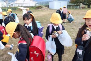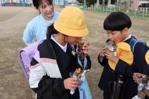 学校の畑では、たくさんのサツマイモが収穫でき、1.2年生は、一人1個大きなサツマイモを持ち帰りました。
