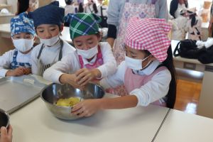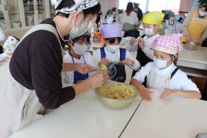 子ども達は、芋をつぶし、材料を混ぜ、茶巾にしぼります。