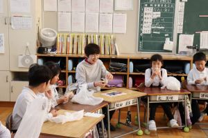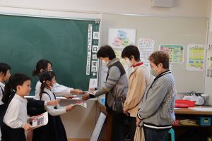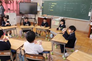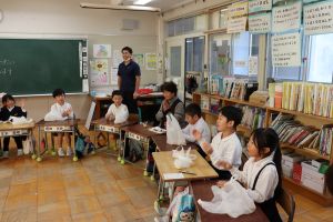 2年生の教室では、さつまいもの苗植えや芋ほりにお手伝いいただいた山先さん、西田さん、村本さんをお招きして一緒に茶巾しぼりをいただきました。