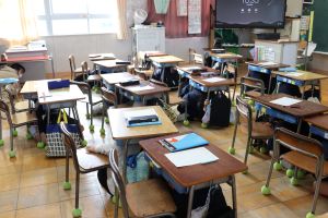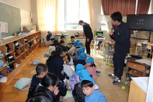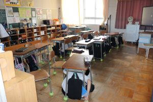 地震による大きな音が聞こえてくると、子ども達は、机の下にもぐり落下物から身を守る行動をとり、揺れが収まるまで動きません。