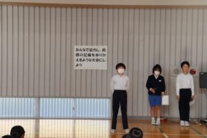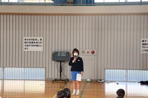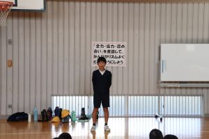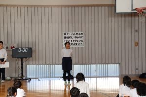 次に、5年生のリーダーが各チームのめあてと目標回数を発表しました。