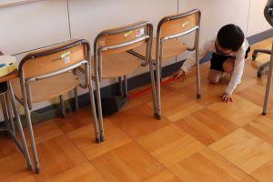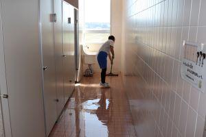 5年生がトイレ床を水を流しながら、ブラシがけしています。