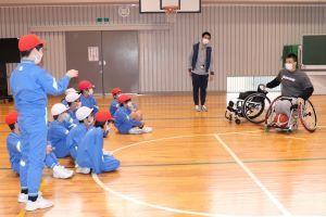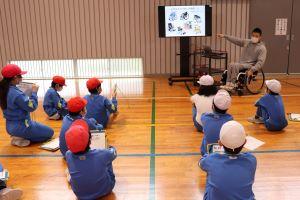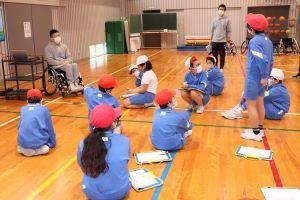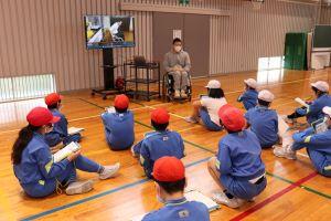 今日は、4年生の「総合的な学習」の時間に、福祉の学習のゲストティーチャーとして車椅子バスケの岩崎さんに来ていただきました。