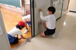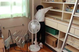 図工室では、ロッカーの奥まで手を伸ばし、水拭きしています。