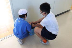 廊下では、6年生が2年生に、雑巾の絞り方を優しく教えていました。