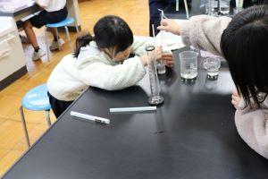 メスシリンダーの目盛りを目と水平になるようにして確認しています