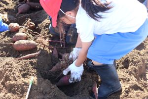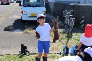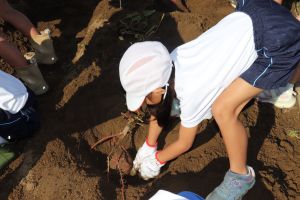 小さな手で一生懸命さつまいもが抜けるまで根気よく掘っていました。