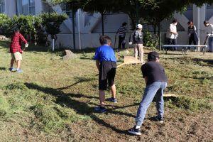 地域の方が草刈りした草を子供達が熊手で集めています。