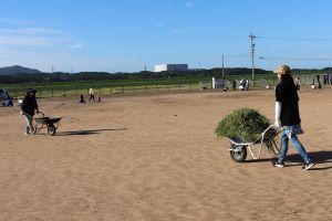 一輪車で刈り取った草を運んでいます。