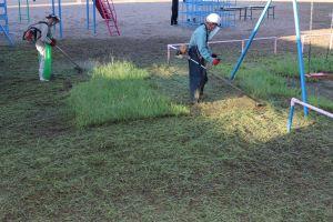 朝6時から、地域の草刈りボランティアさんが、鉄棒やブランコの周りを草刈り機できれいにしてくださいました。