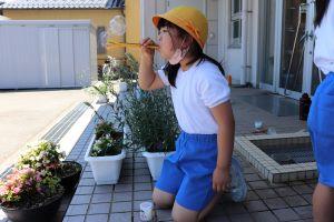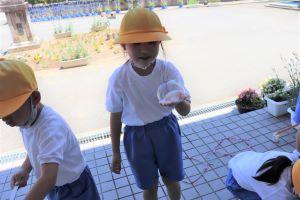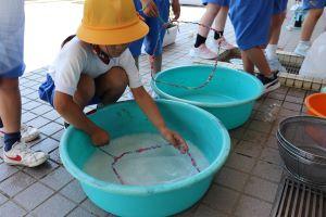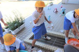 今日は、1年生が生活の学習「夏と遊ぼう」で、シャボン玉遊びをしていました。