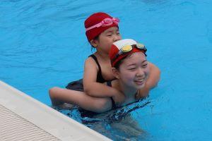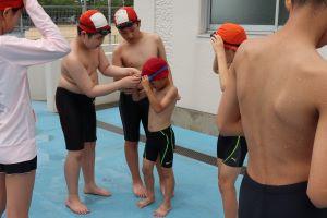 初めてプールに入る1年生を6年生が一緒に入って、仲を深めながら、水に慣れる活動です。
