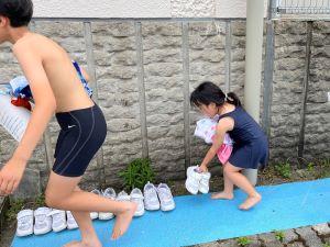 6年生のまねをして、きちんとズックを並べる1年生。えらい!