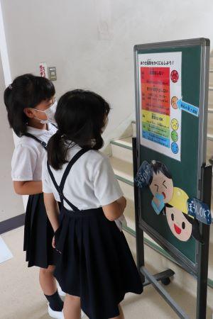 学校では、1日に3回(朝、長休みの前、昼休みの前)、保健の先生が熱中症指数計で測定し、階段前掲示板で子どもたちに注意を呼びかけています。