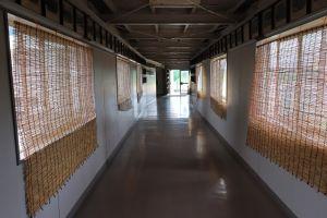 体育館への渡り廊下は太陽がふりそそぐので、暑さ対策のため、日よけを掛けました。