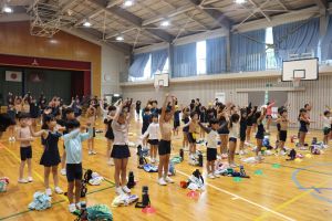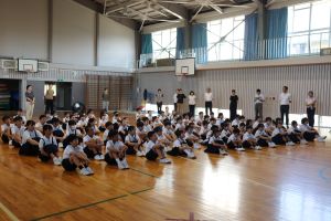 体育館でかがやき児童会のあいさつと準備体操を行いました。