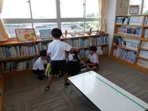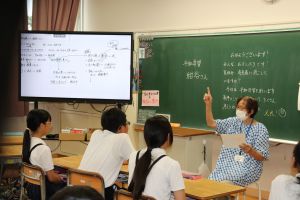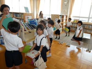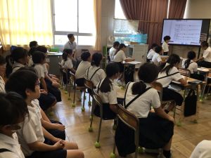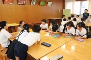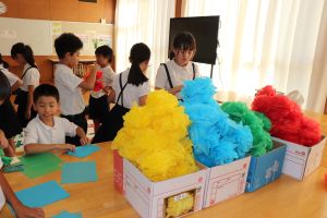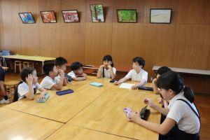始業式の後、人間関係づくりに取り組んだり、夏休みの工作や研究の紹介を行ったりしていました。